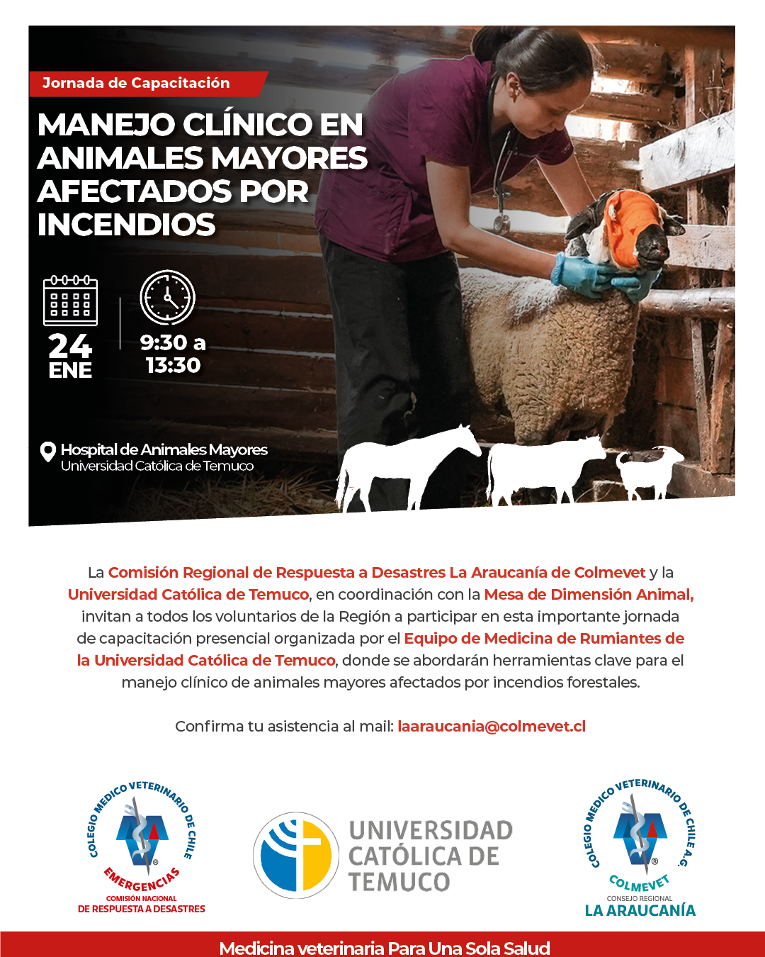 La Comisión Regional de Respuesta a Desastres La Araucanía de Colmevet y la Universidad Católica de Temuco, en coordinación con la Mesa de Dimensión Animal, invitan a todos los voluntarios de la Región a participar en esta importante jornada de capacitación presencial organizada por el Equipo de Medicina de Rumiantes de la Universidad Católica de Temuco, que se realizará el día viernes 24 de enero, en el Hospital de Animales Mayores