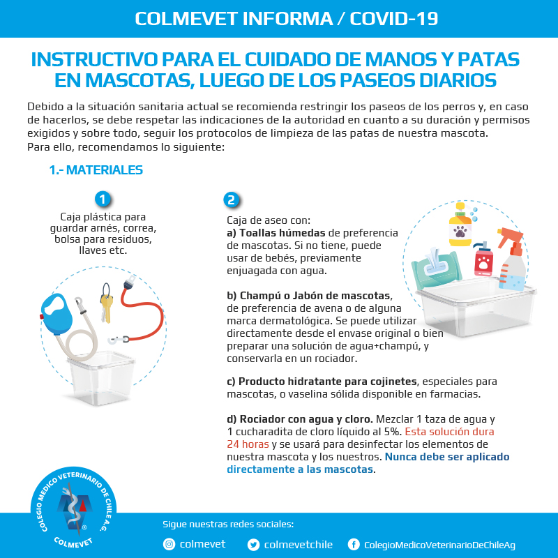• Es importante, una vez terminado el paseo de vuelta a casa, lavar las patas de tu mascota con una solución de agua y jabón (idealmente hipoalergénico) y secarlas con toallas de papel. Si tu mascota presenta alguna enfermedad de base dermatológica, es necesario que te comuniques con su médico veterinario tratante y/o especialista en el área para consultas más específicas.