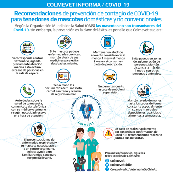 • Revisar en las redes sociales de los centros veterinarios los horarios en que se recibirán llamadas o mensajes. No asistir al centro para solicitar hora o atención.