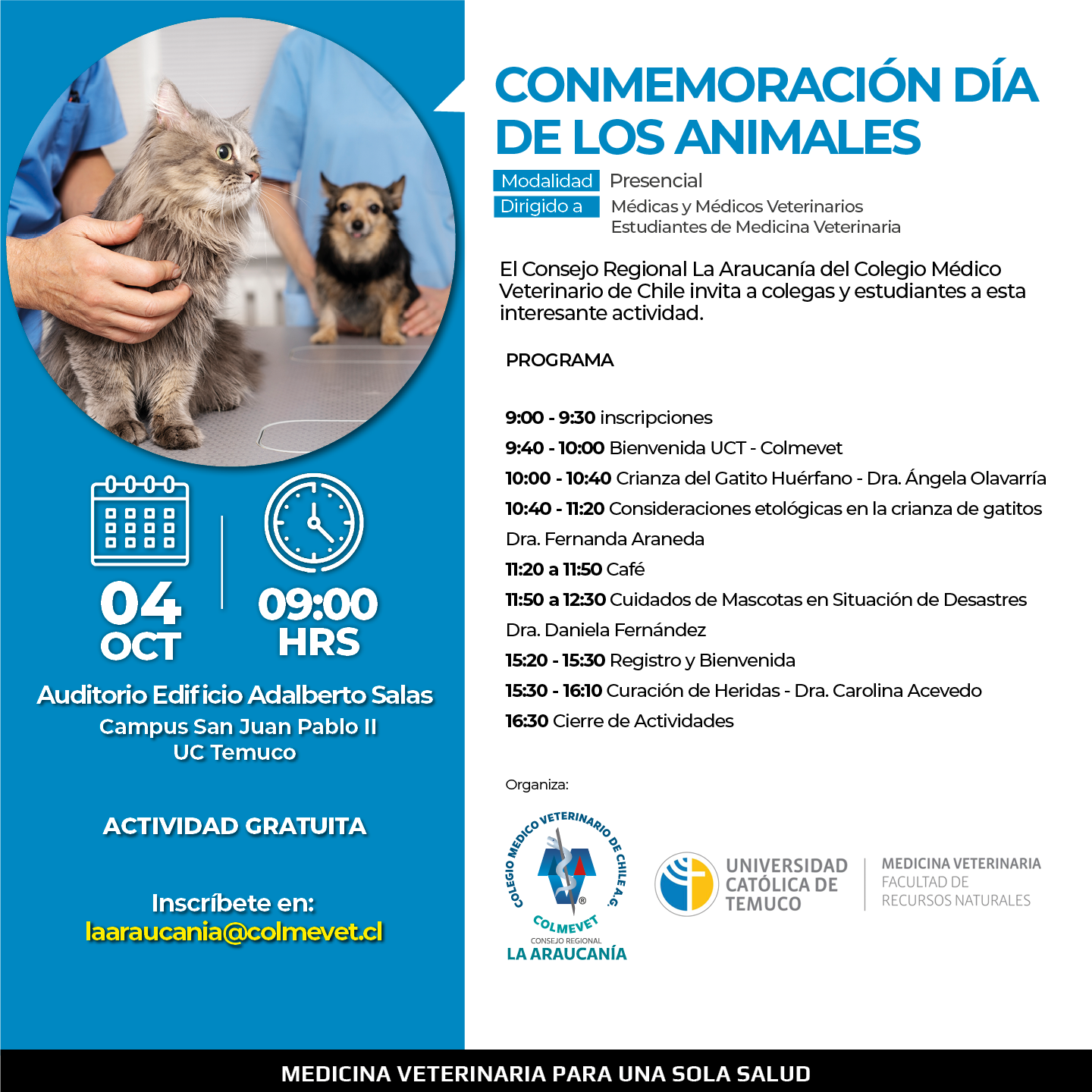 En el marco del Día de Los Animales, el Consejo Regional La Araucanía del Colegio Médico Veterinario de Chile invita a colegas y estudiantes a esta interesante actividad a realizarse en el Auditorio Edificio Adalberto Salas del Campus San Juan Pablo II, UC Temuco, desde las 09:00 Hrs.