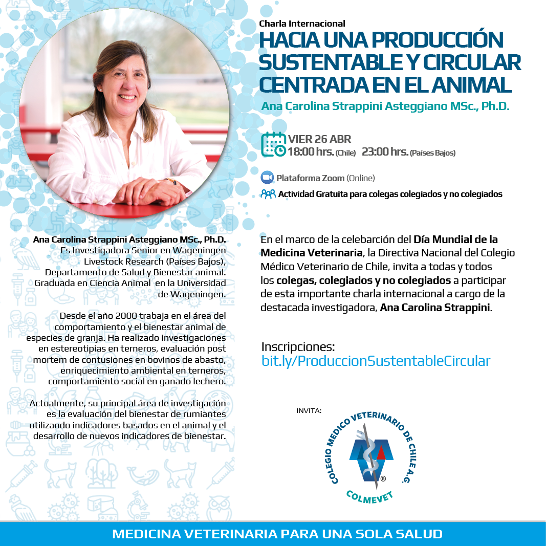 En el marco de la celebarción del Día Mundial de la Medicina Veterinaria, la Directiva Nacional del Colegio Médico Veterinario de Chile, invita a todas y todos los colegas, colegiados y no colegiados a participar de esta importante charla internacional a cargo de la destacada investigadora, Ana Carolina Strappini. Les esperamos este viernes 26 de abril a las 17:00 hrs. Chile y 23:00 hrs, Paises Bajos.