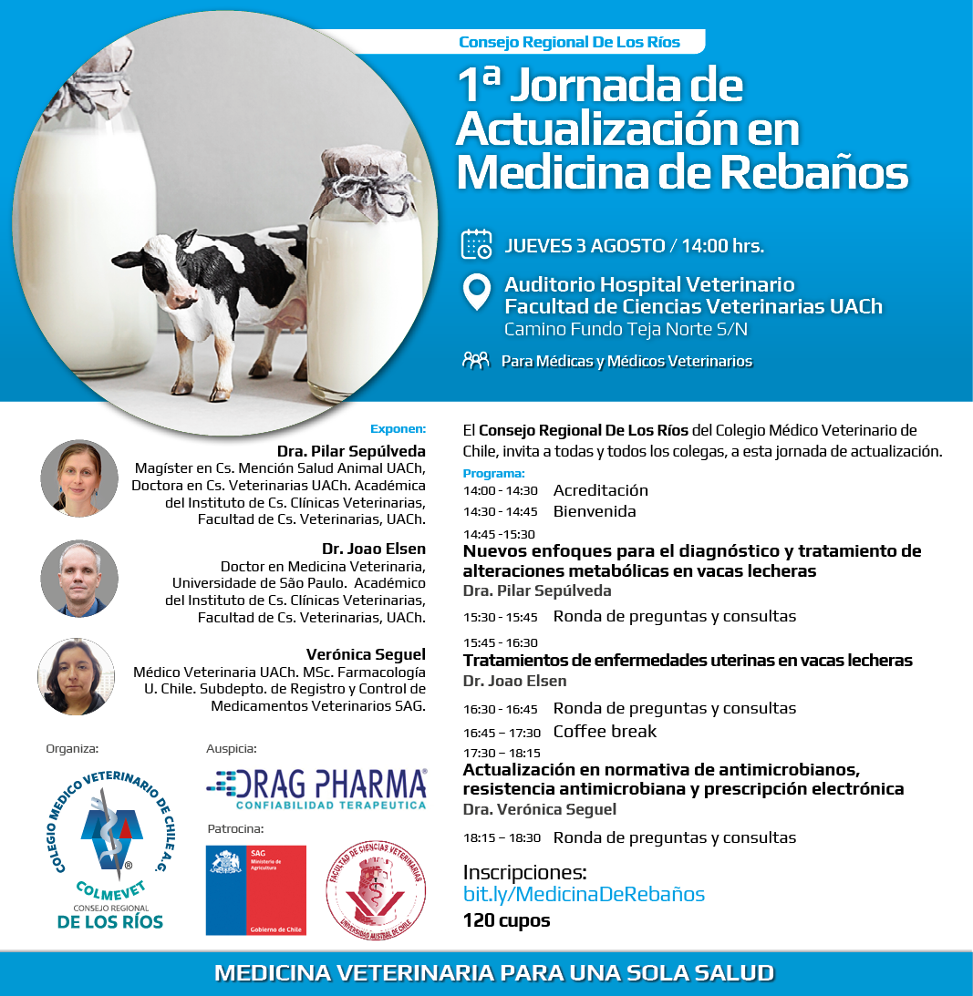 El Consejo Regional De Los Ríos del Colegio Médico Veterinario de Chile, invita a todas y todos los colegas, a esta jornada de actualización, a realizarse el jueves 3 de agosto en el Auditorio del Hospital Veterinario de la Facultad de Ciencias Veterinarias UACh, ubicado en Camino Fundo Teja Norte S/N, Valdivia.