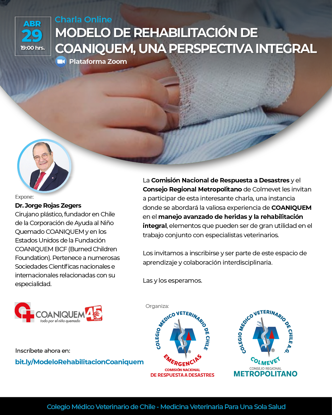 La Comisión Nacional de Respuesta a Desastres y el Consejo Regional Metropolitano de Colmevet les invitan a participar de esta interesante charla, una instancia donde se abordará la valiosa experiencia de COANIQUEM en el manejo avanzado de heridas y la rehabilitación integral, elementos que pueden ser de gran utilidad en el trabajo conjunto con especialistas veterinarios.