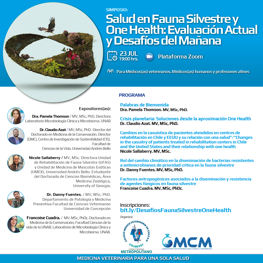 El Consejo Regional Metropolitano de Colmevet y el Laboratorio de Microbiología Clínica y Microbioma - MCM, les invitan a participar este martes 23 de julio a las 19:00 hrs., del Simposio "Salud en Fauna Silvestre y One Health: Evaluación Actual y Desafíos del Mañana".